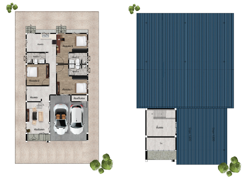 พื้นที่ใช้สอย : 134 ตร.ม. : 3 ห้องนอน / 3 ห้องน้ำ / 1 ห้องครัว / 1 ชั้นลอย / 2 พื้นที่จอดรถ